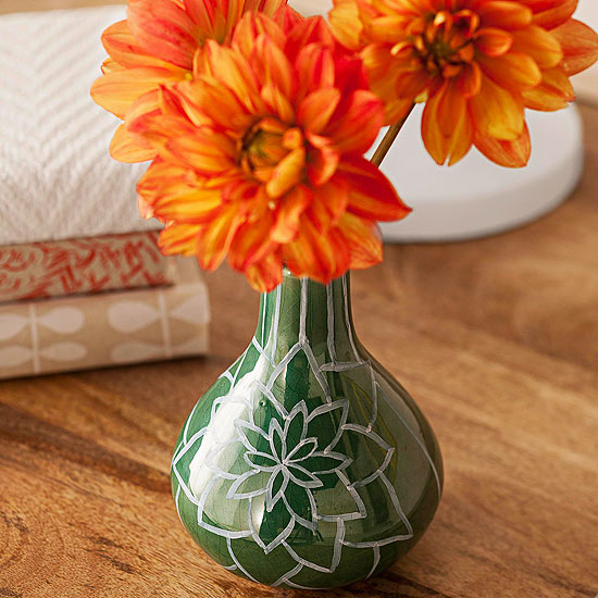 Customize a plain vase by taping off a chevron pattern with painter's tape (it need not be perfect). Spray paint the exposed area with a lighter shade of the vase color. Remove the tape when the paint is dry.